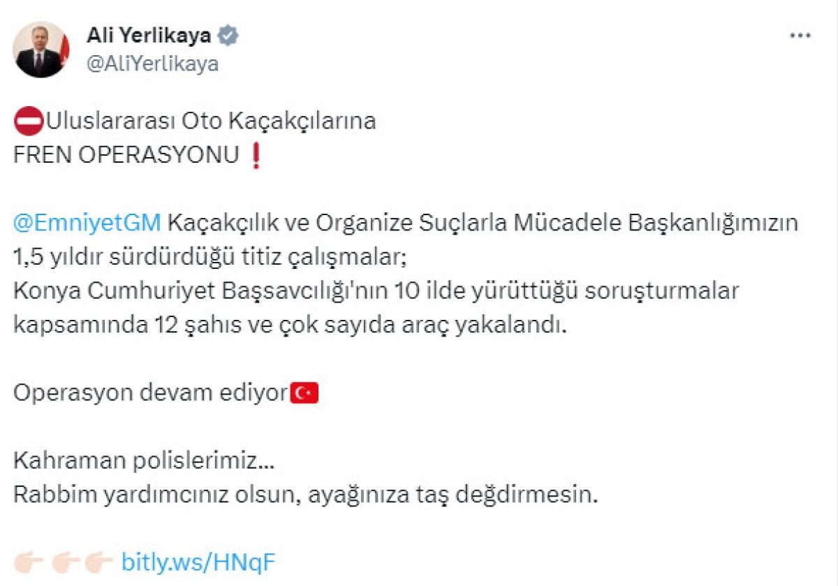 Ali Yerlikaya, paylaşımında şu bilgilere yer verdi: