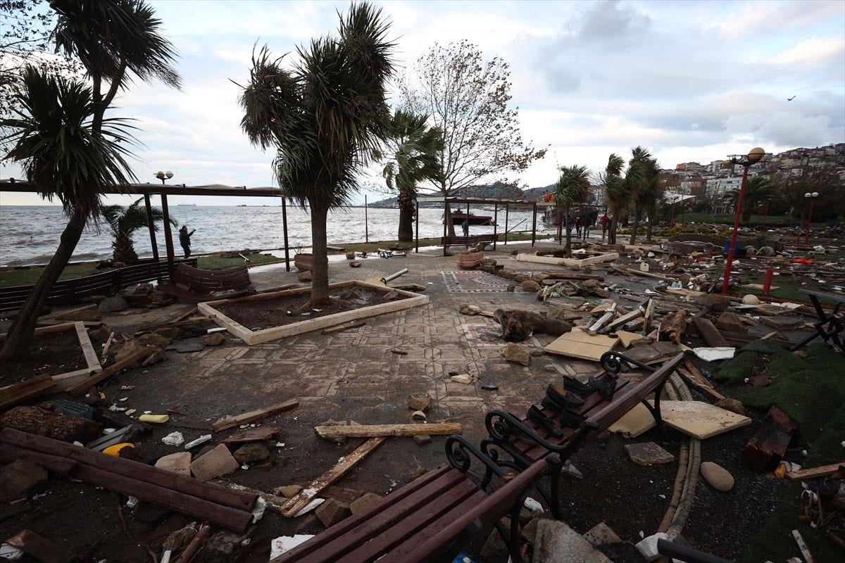 Şehri vuran fırtına nedeniyle kıyıya vuran gemi battı.