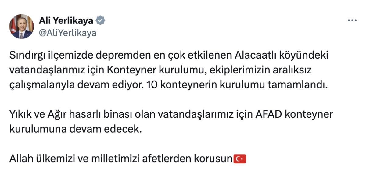 İçişleri Bakanı Ali Yerlikaya, depremden en çok etkilenen Sındırgı'ya bağlı Alacaatlı köyünde devam eden konteyner çalışmalarına ilişkin bilgilendirmede bulundu.