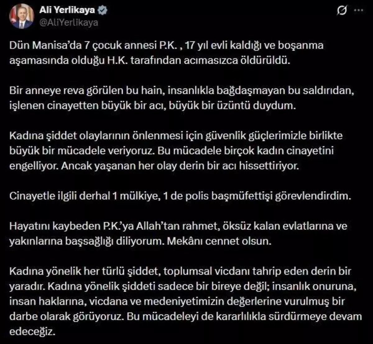 İçişleri Bakanı Ali Yerlikaya, Manisa'da 7 çocuk annesi kadının eşi tarafından öldürülmesine ilişkin, sosyal medyadan bir açıklama yayınladı.