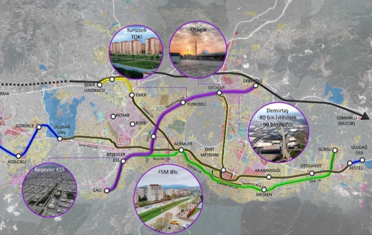 Kuzey-güney yönünde ilk olma özelliği taşıyan, 22 kilometre uzunluğuyla toplam 16 istasyondan oluşan hattımız, sanayisi ve yoğun nüfusu olan Çalı bölgesinden başlayarak, Beşevler, Fatih Sultan Mehmet Bulvarı, Yunuseli üzerinden Bursa Terminali’ne ulaşacak. Yine sanayi ve yoğun nüfus barındıran Demirtaş’a hızlı ve konforlu bir şekilde erişimi sağlayacak. Tüm bu çalışmalarımızla birlikte önümüzdeki dönem sonunda toplam raylı sistem hattımızı 89 kilometreye ulaştırarak, toplu taşımada önemli bir dönüşümü gerçekleştireceğiz. Bizler dersimize çalıştık. Ayaklar üzerine basan projeleri hayata geçireceğiz.
