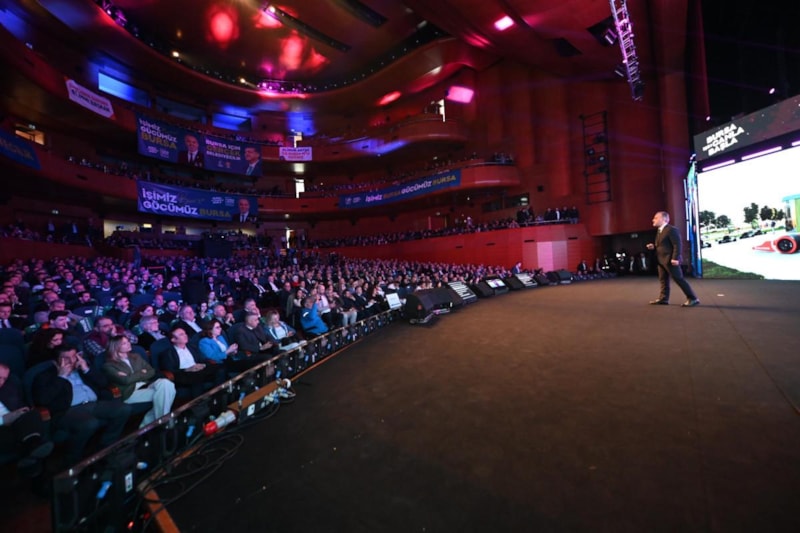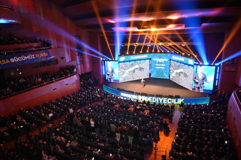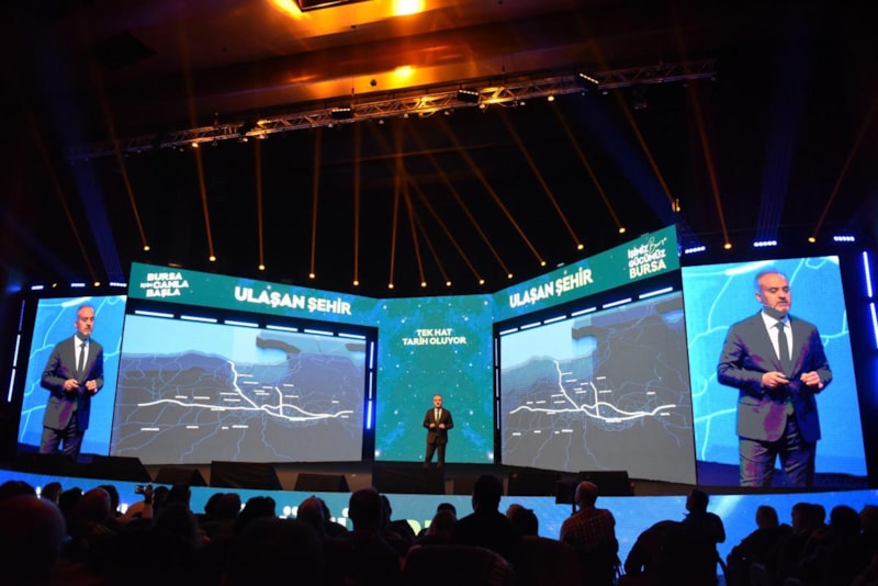 Görsel bir şölen şeklinde hazırlanan toplantıda ilk olarak gelişen teknolojiyi kullanarak sahneye interaktif hologram video mapping gösterisiyle çıkan Bursa Büyükşehir Belediye Başkanı Alinur Aktaş, 'Şimdi dönüşüm zamanı' sloganıyla şehre dair vizyonun ana başlıklarını paylaştı.