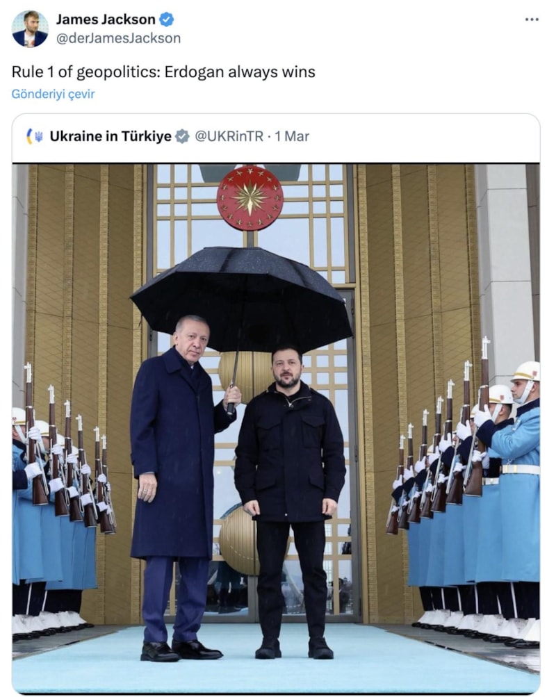 Jackson, Erdoğan ve Zelensky'nin şemsiyeli fotoğrafını paylaşırken, "Jeopolitiğin 1. kuralı: Erdoğan her zaman kazanır." ifadelerini kullandı.