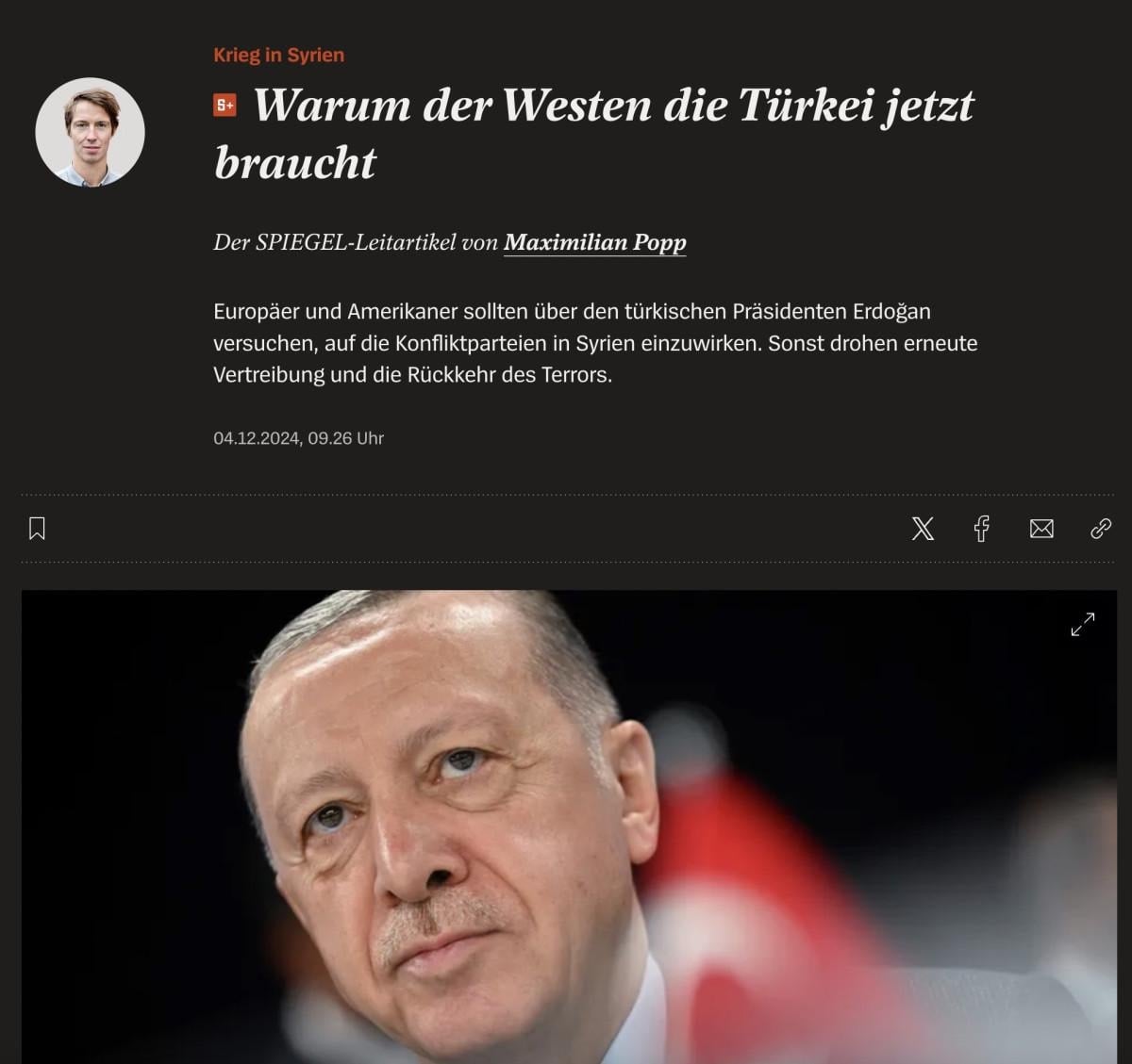 Alman Spiegel dergisi Suriye'de yaşanan gelişmelere ilişkin yayımladığı makalede Türkiye ve Cumhurbaşkanı Recep Tayyip Erdoğan'ın rolüne dikkat çekti.