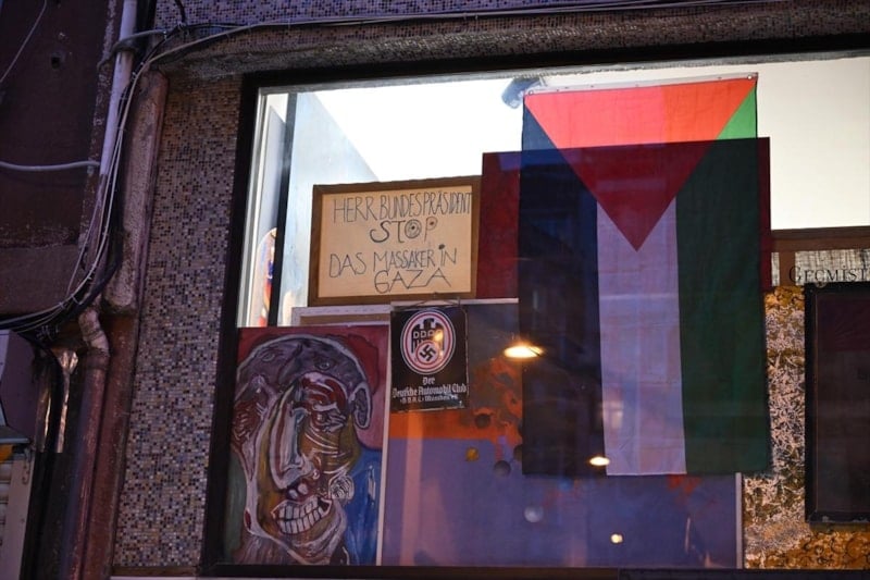 Müzenin karşısında bulunan bir antikacı dükkanı, Filistin bayrakları asıp “Leve Palestina” şarkısını çalarak Steinmeir’i protesto etti.