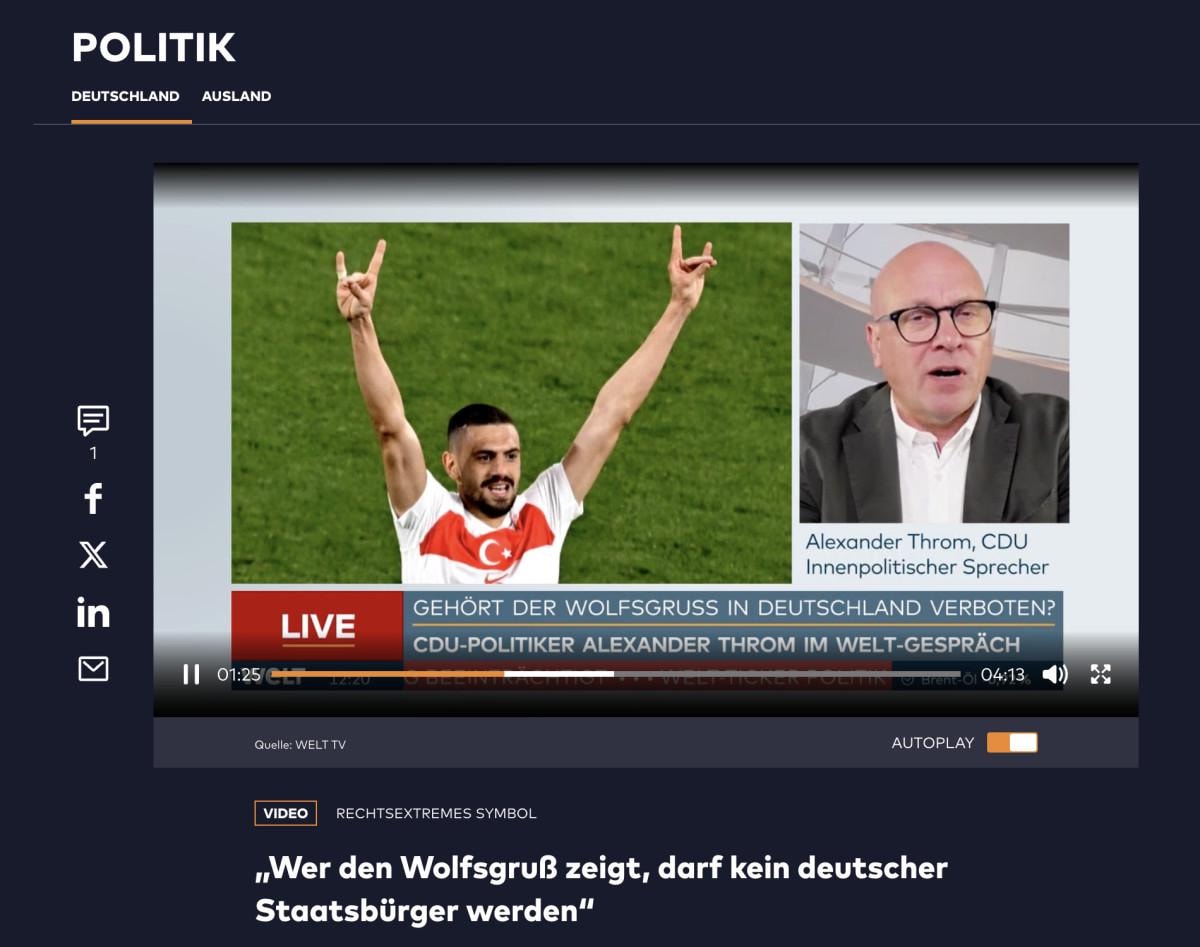 Welt'te yer alan haberde, "Tartışma yaratan kurt selamı, Türkiye Avrupa Şampiyonası çeyrek final maçında binlerce taraftar tarafından gösterildi. Giderek daha fazla politikacı, aşırı sağcı sembolün ve 'Bozkurtlar' örgütünün yasaklanması çağrısında bulunuyor. CDU siyasetçisi Alexander Throm da acilen harekete geçilmesi gerektiğini düşünüyor." ifadeleri kullanıldı.