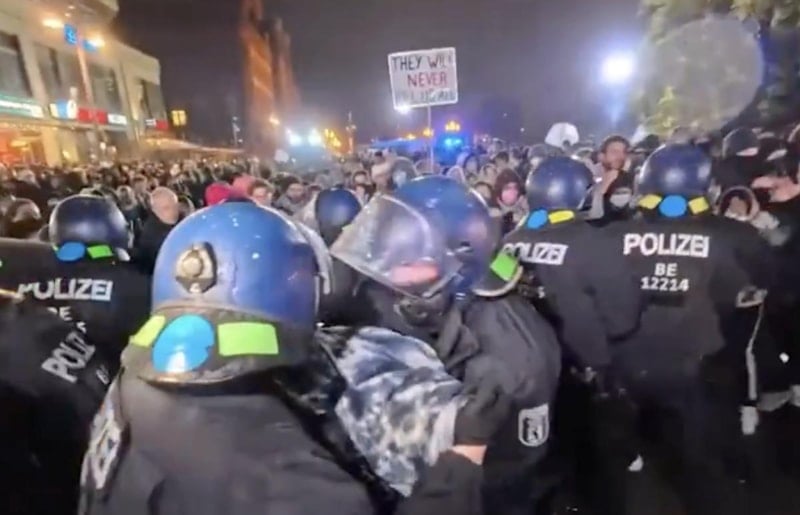 Başkent Berlin'de halkın İsrail karşıtı protestolarında kent polisi, sert müdahalede bulundu. Kentin simge yapılarından olan Brandenburg Kapısı'nın dış yüzeyine ise İsrail bayrağı yansıtıldı.