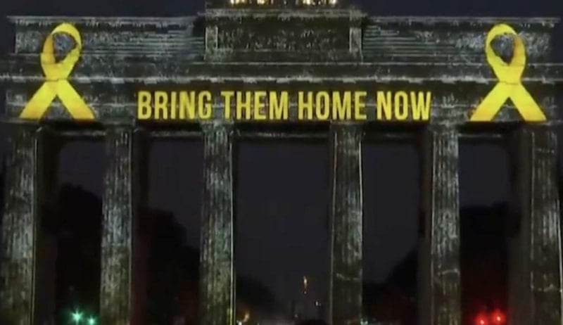 Bayrak "Bring Them Home Now" (Onları Eve Getirin) mesajıyla yapının dış yüzeyini aydınlattı.