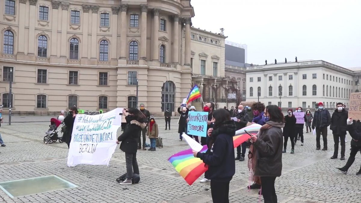 Ülkenin köklü üniversitelerinden Humboldt Üniversitesi’nin önündeki Bebel Meydanı'nda LGBT üyeleri Boğaziçi Üniversitesi'ne rektör atamasını protesto etti.