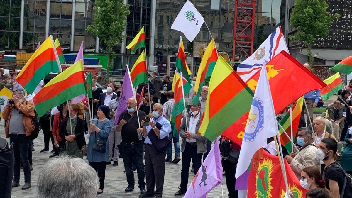 Yaklaşık 300 kadar protestocu, geçen aylarda kırmızı bültenle aranan ve Türk Silahlı Kuvvetleri tarafından etkisiz hale getirilen teröristlerin afişleri önünde saygı duruşunda bulundu.