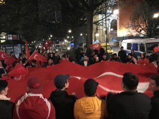 Burada büyük bir Türk bayrağı açan vatandaşlar "Recep Tayyip Erdoğan", "Dik dur eğilme gurbetçiler seninle" ve "Ya Allah bismillah, Allah-u ekber" sloganları attı.