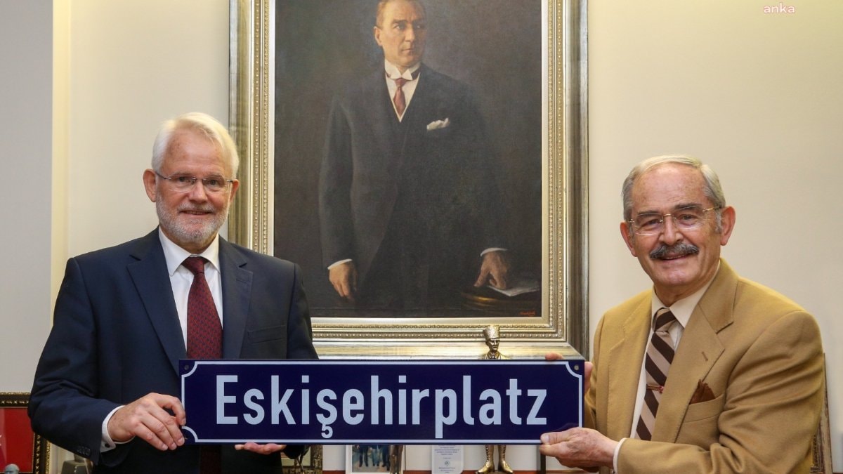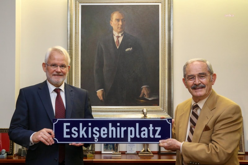 Ziyaret sonunda Büyükerşen ve Başkonsolos Regenbrecht, Frankfurt’ta Eskişehir ismi verilen meydanın, ‘Eskişehirplatz’ yazılı tabelasıyla hatıra fotoğrafı çektirdi.