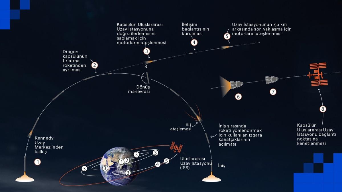 Uzay aracı, Florida’daki Kennedy Uzay Merkezi’nde bulunan Fırlatma Kompleksi 39A’dan kalkacak. Araç buradan da Uluslararası Uzay İstasyonu’na uçacak.