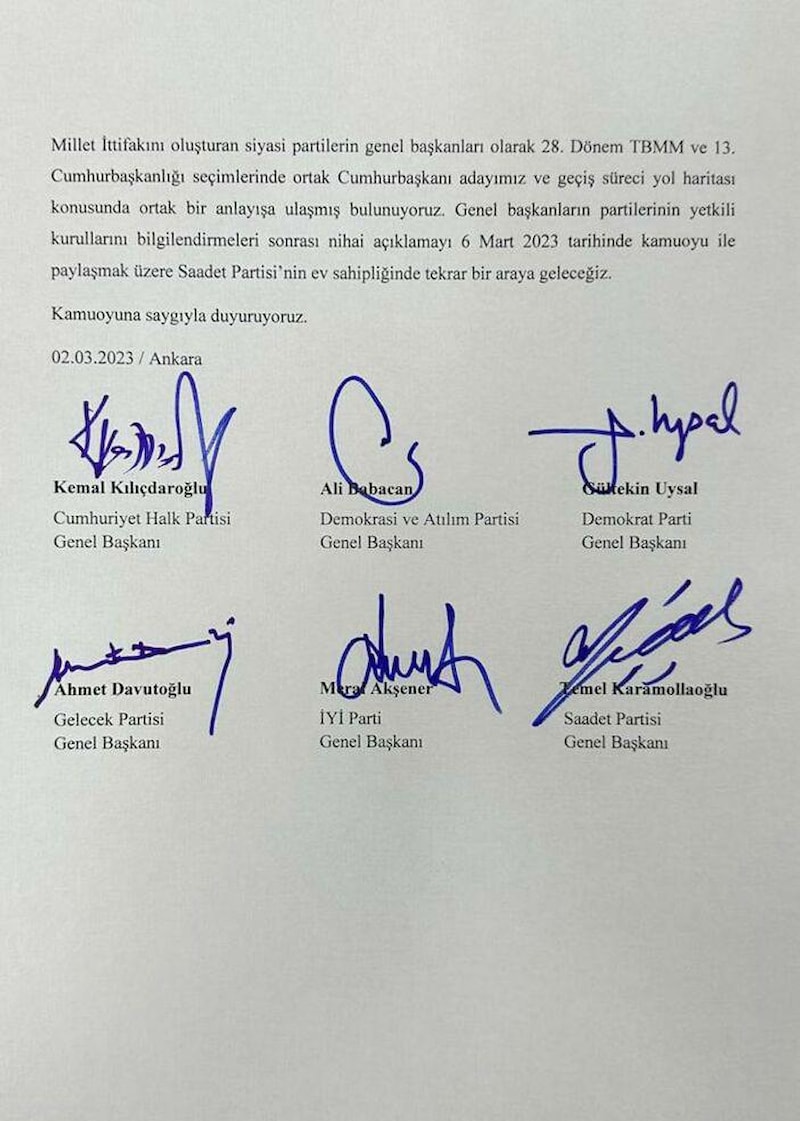 Genel başkanların partilerinin yetkili kurullarını bilgilendirmeleri sonrası nihai açıklamayı 6 Mart 2023 tarihinde kamuoyu ile paylaşmak üzere Saadet Partisi'nin ev sahipliğinde tekrar bir araya geleceğiz.