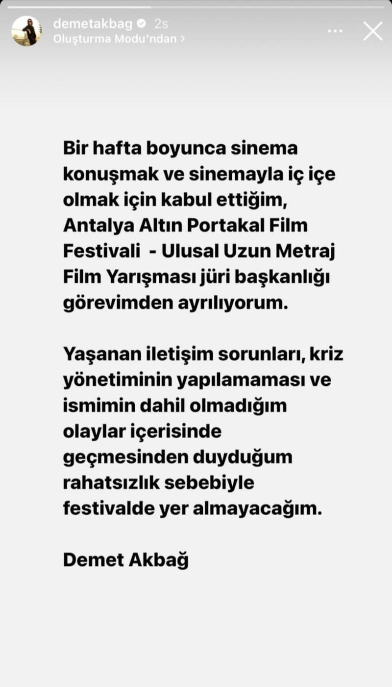 Yaşanan iletişim sorunları, kriz yönetiminin yapılmaması ve ismimin dahil olmadığım olaylar içerisinde geçmesinden duyduğum rahatsızlık sebebiyle festivalde yer almayacağım. Demet Akbağ
