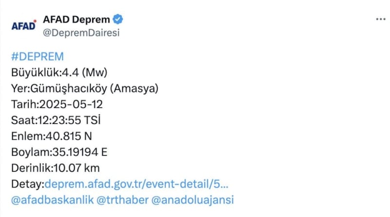 AFAD verilerine göre Amasya'nın Gümüşhacıköy ilçesinde 4.4 büyüklüğünde bir deprem meydana geldi. Deprem, Çorum ve Samsun çevresinde de hissedildi.