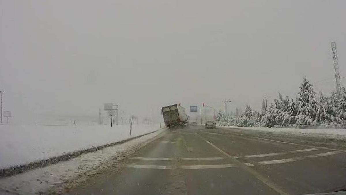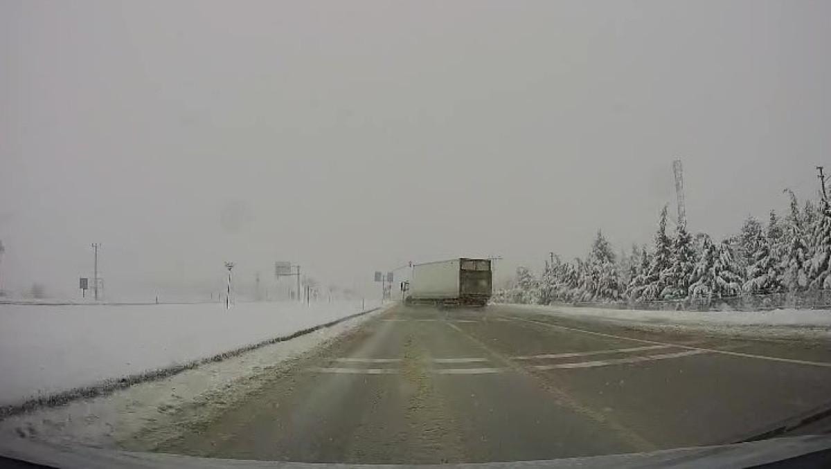 Amasya-Merzifon yolunda kar yağışının etkili olduğu sabah saatlerinde, bir tır sürücüsü yavaşlayan otomobile çarpmamak için ani bir manevra yaptı.