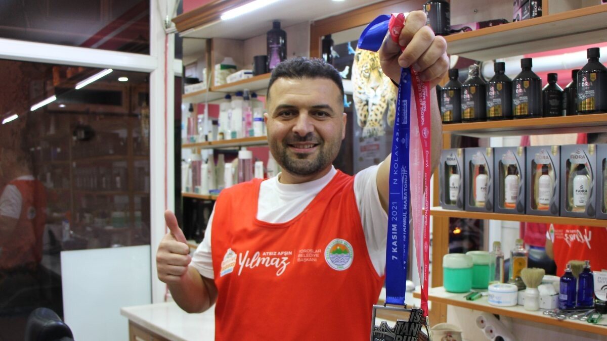 Amasya'da 6 ay öncesinde atletizme ilgi duyması üzerine kentte bu sporla ilgilenen sporcularla tanışan evli ve 3 çocuk babası Tümer Keleş, müşterilerini de aksatmamak için ısınma hareketlerini berber salonunda, koşuları ise karşı apartmanın merdivenlerinde yapıyor.