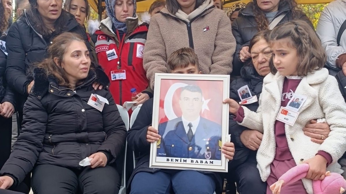 Cenaze töreninde şehidin annesi Dilşat ve babası Ümit Kaplan gözyaşı dökerken, eşi Hülya Kaplan da oğlu Poyraz ve kızı Cemre Kaplan'a sarılarak gözyaşı döktü.