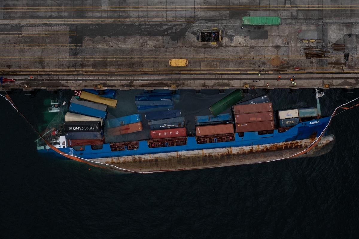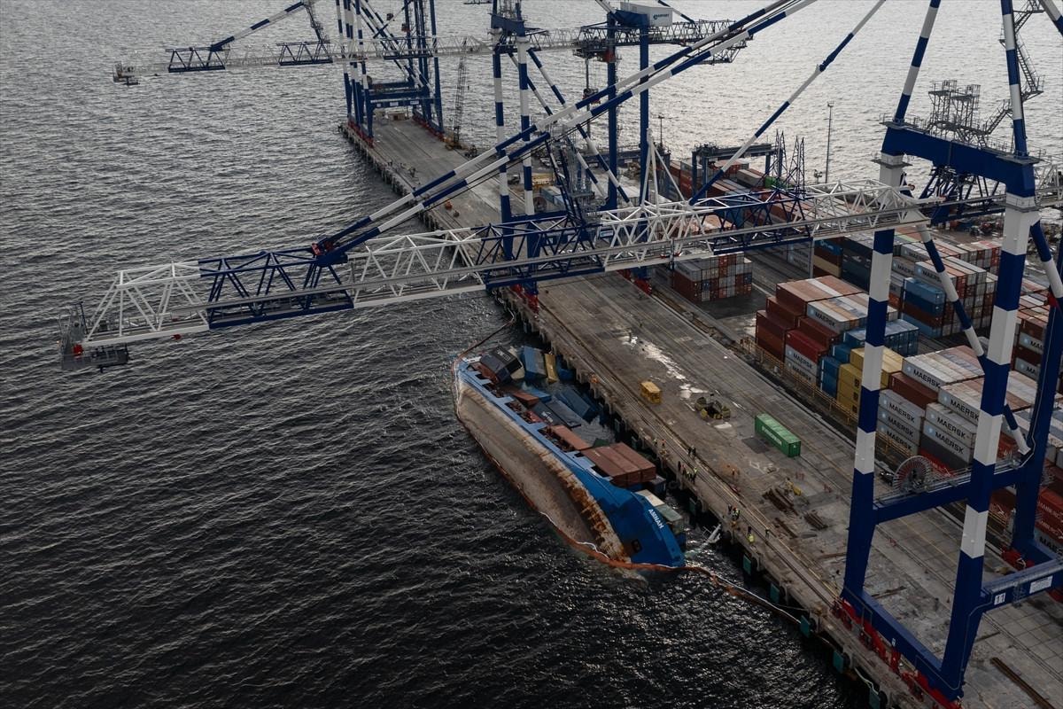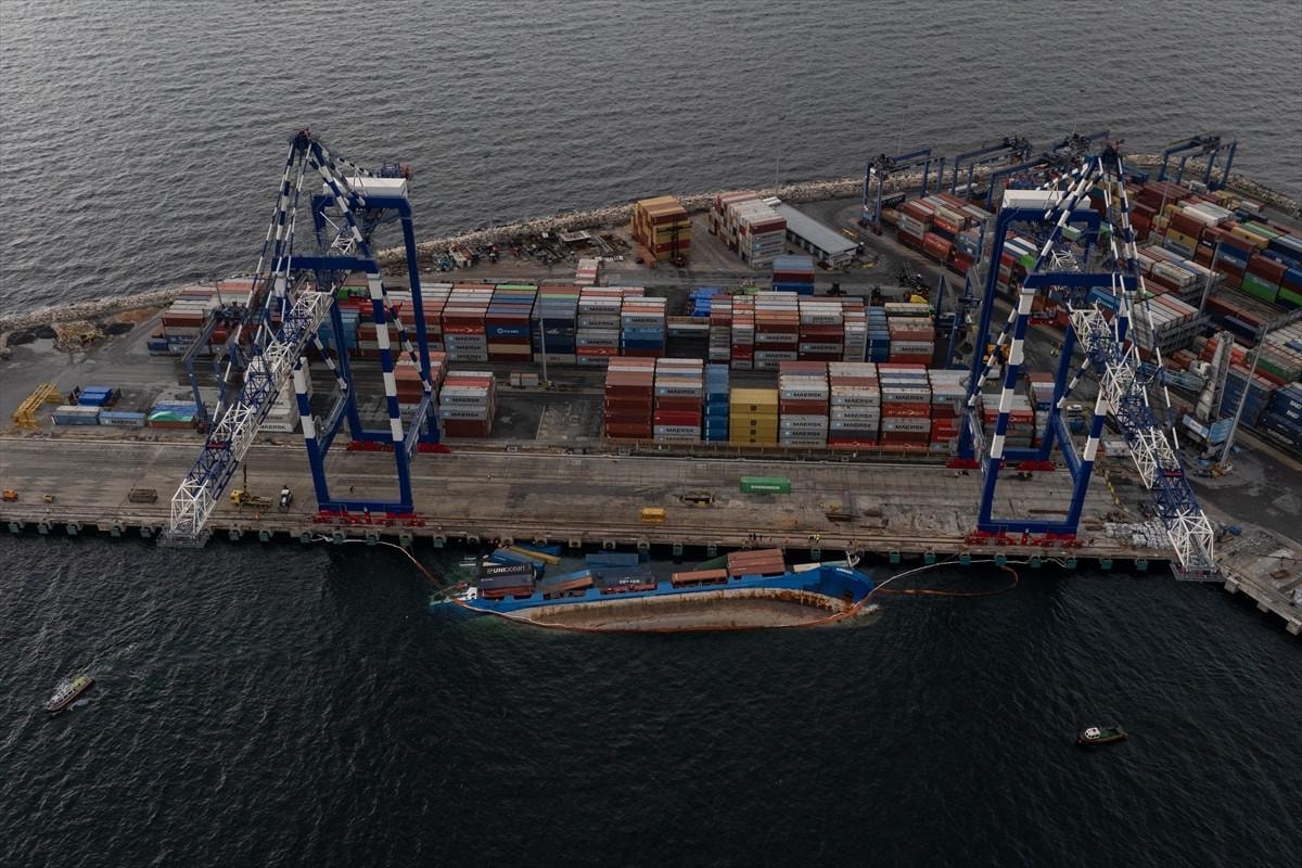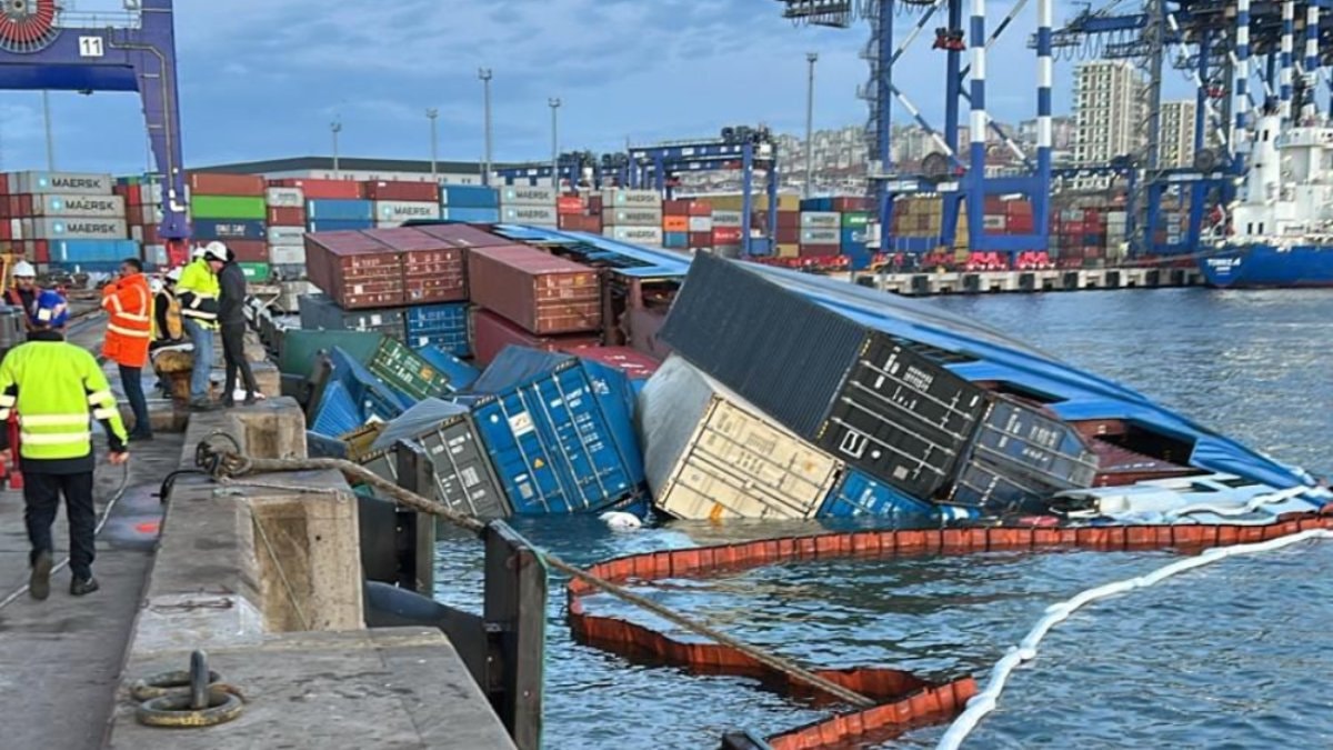 Liman başkanlığı koordinasyonunda, denize düşen konteynerlerin çıkarılması ve yan yatan geminin kaldırılması için çalışmalar sürüyor.
