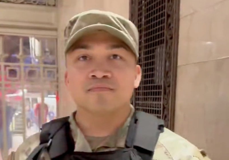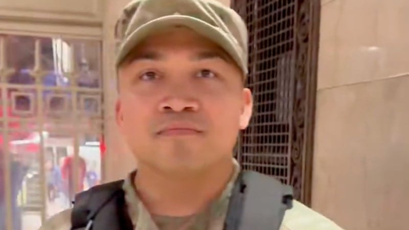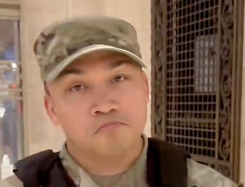 Ancak asker, soruların hiçbirine net bir yanıt vermezken, o anları kayda alan şahıs, "Bu soruya cevap veremez misiniz, Amerika önce geliyor diyemiyor musunuz?" sözleriyle askerin üzerine gitti.