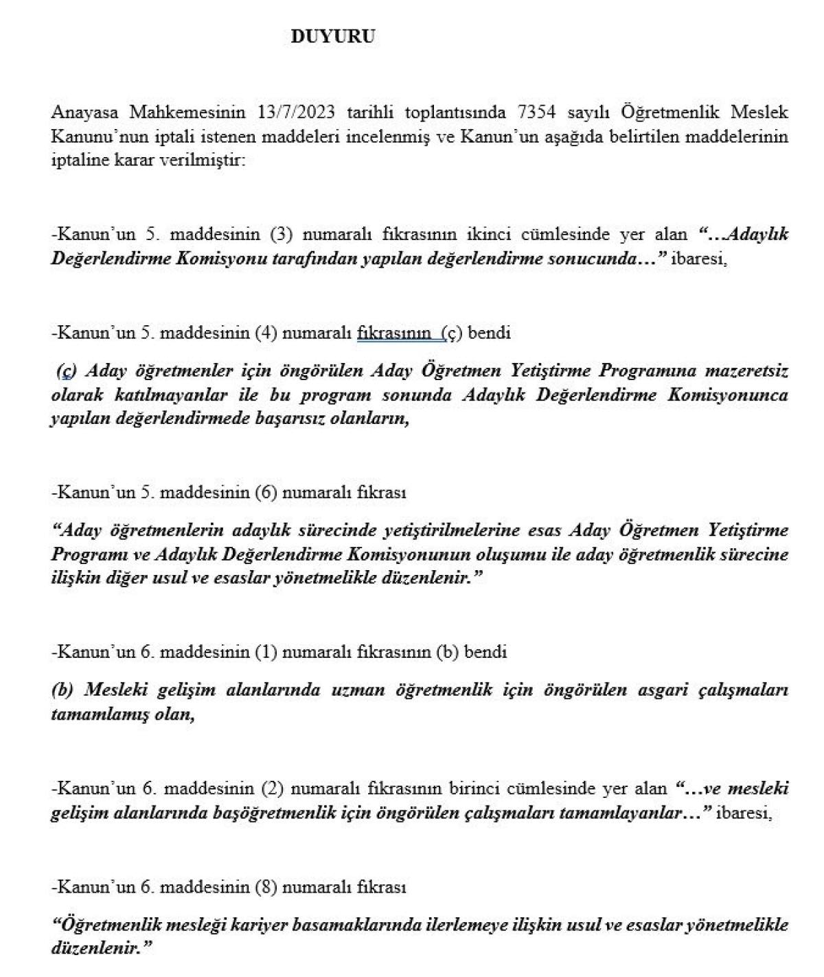 AYM bazı maddeleri iptal etti