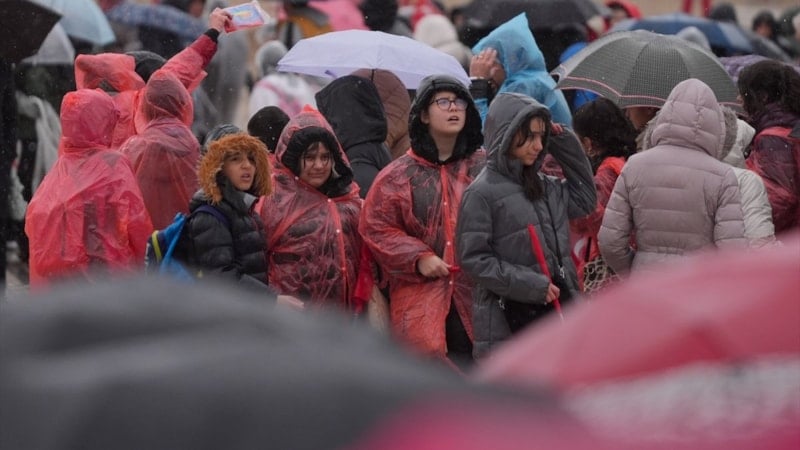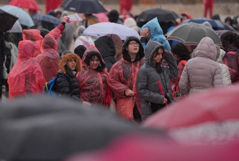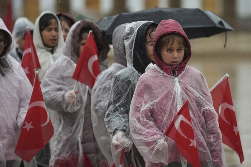 Minik öğrenciler giydikleri yağmurluklarla yağmurdan korunmaya çalışırken, siyasi ve askeri heyetler de şemsiyelerle kendilerini korudu.