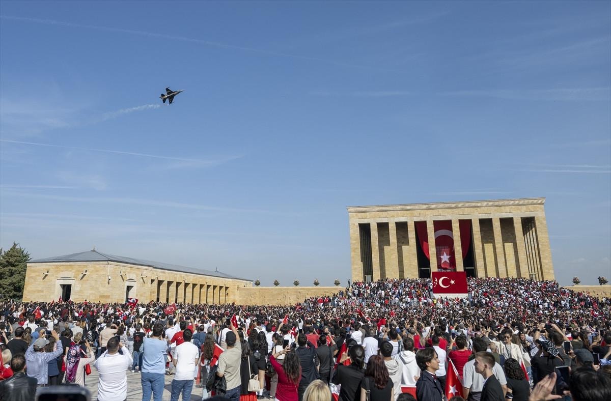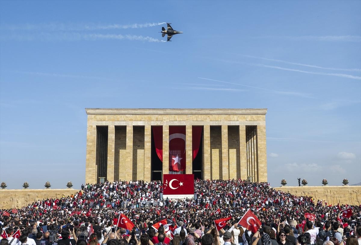 Devlet erkanının ayrıkmasının ardından Türk Hava Kuvvetleri'nin akrobasi timi SOLOTÜRK, Türkiye Cumhuriyeti'nin 100. kuruluş yıl dönümü dolayısıyla Ankara semalarında gösteri uçuşu gerçekleştirdi.