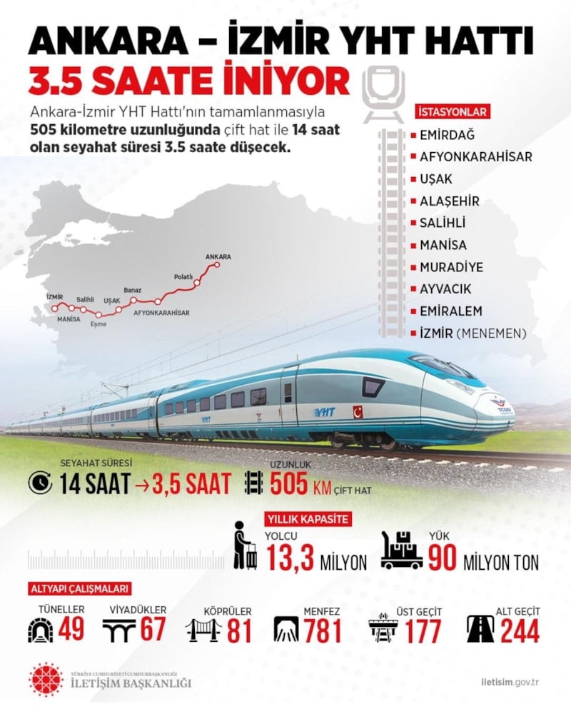 Cumhurbaşkanlığı İletişim Başkanlığı, inşası süren Ankara-İzmir Yüksek Hızlı Tren (YHT) Hattı'na ilişkin merak edilenleri paylaştı.
