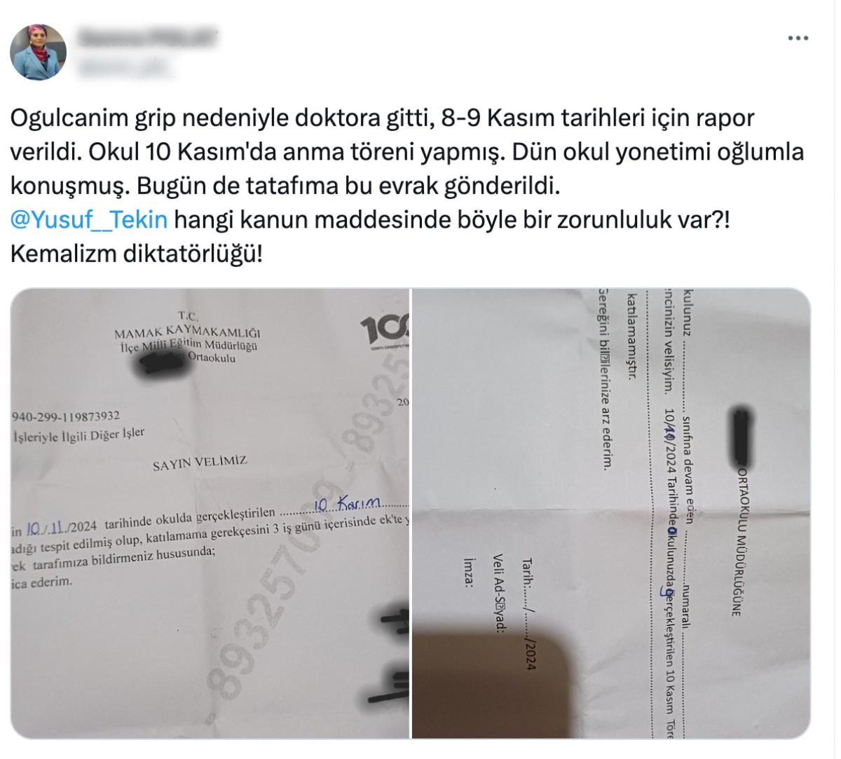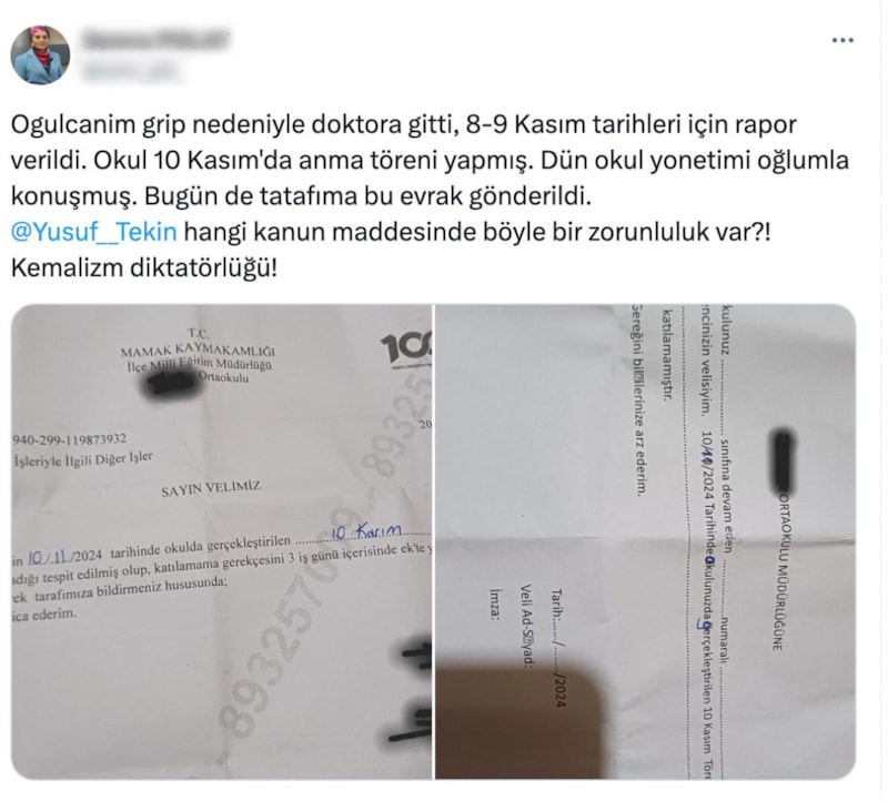 Sosyal medyadan paylaşım yapan anne Semra Polat, "Oğulcan'ım grip nedeniyle doktora gitti, 8-9 Kasım tarihleri için rapor verildi. Okul 10 Kasım'da anma töreni yapmış. Dün okul yönetimi oğlumla konuşmuş. Bugün de tarafıma bu evrak gönderildi." ifadelerine yer verdi.