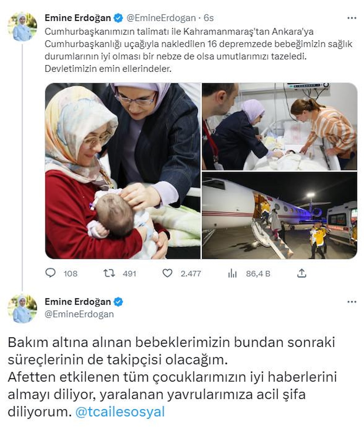 Cumhurbaşkanı'mızın talimatı ile Kahramanmaraş'tan Ankara'ya Cumhurbaşkanlığı uçağıyla nakledilen 16 depremzede bebeğimizin sağlık durumlarının iyi olması bir nebze de olsa umutlarımızı tazeledi. Devletimizin emin ellerindeler. Bakım altına alınan bebeklerimizin bundan sonraki süreçlerinin de takipçisi olacağım. Afetten etkilenen tüm çocuklarımızın iyi haberlerini almayı diliyor, yaralanan yavrularımıza acil şifa diliyorum.