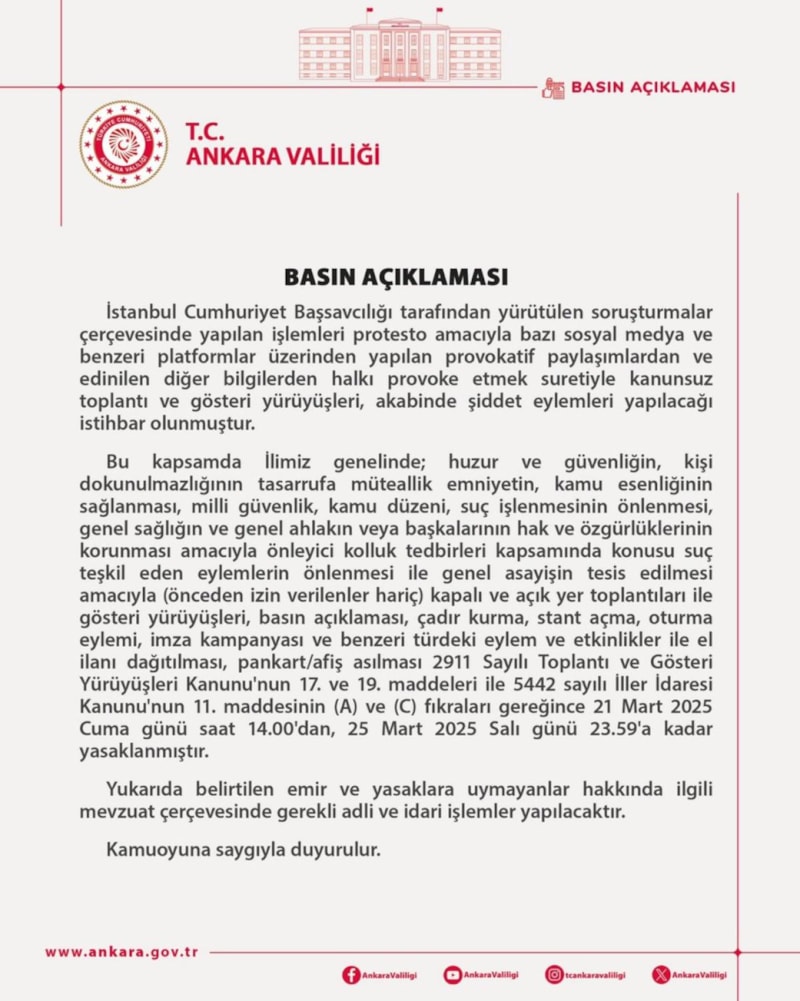 Bu kapsamda İlimiz genelinde; huzur ve güvenliğin, kişi dokunulmazlığının tasarrufa müteallik emniyetin, kamu esenliğinin sağlanması, milli güvenlik, kamu düzeni, suç işlenmesinin önlenmesi, genel sağlığın ve genel ahlakın veya başkalarının hak ve özgürlüklerinin korunması amacıyla önleyici kolluk tedbirleri kapsamında konusu suç teşkil eden eylemlerin önlenmesi ile genel asayişin tesis edilmesi amacıyla (önceden izin verilenler hariç) kapalı ve açık yer toplantıları ile gösteri yürüyüşleri, basın açıklaması, çadır kurma, stant açma, oturma eylemi, imza kampanyası ve benzeri türdeki eylem ve etkinlikler ile el ilanı dağıtılması, pankart/afiş asılması 2911 Sayılı Toplantı ve Gösteri Yürüyüşleri Kanunu'nun 17. ve 19. maddeleri ile 5442 sayılı İller İdaresi Kanunu'nun 11. maddesinin (A) ve (C) fıkraları gereğince 21 Mart 2025 Cuma günü saat 14.00'ten, 25 Mart 2025 Salı günü 23.59'a kadar yasaklanmıştır.