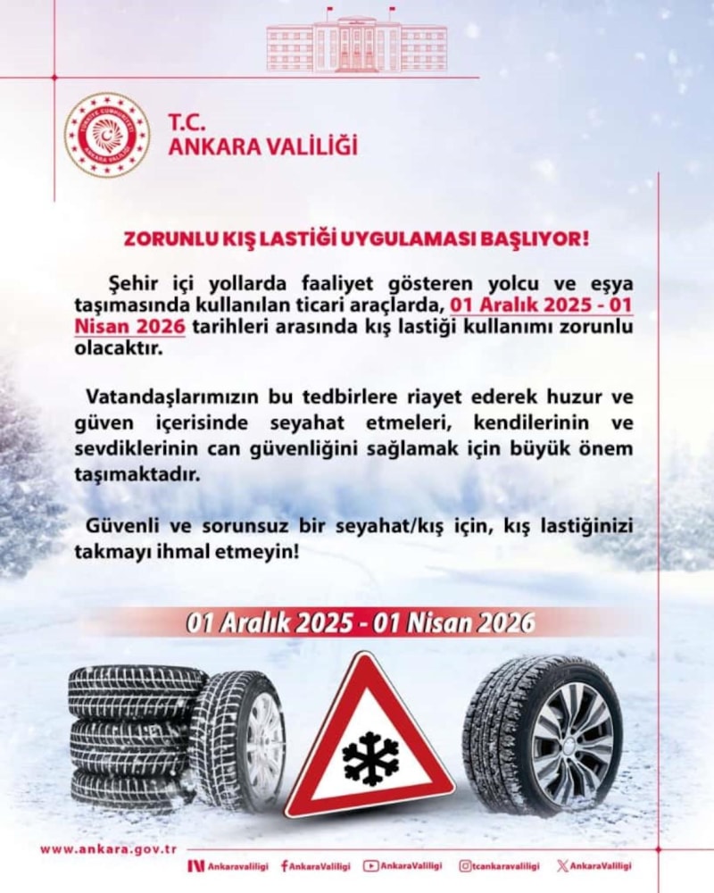 Ankara Valiliği, 1 Aralık 2025-1 Nisan 2026 tarihleri arasında kış lastiği kullanımının zorunlu olacağını duyurdu.