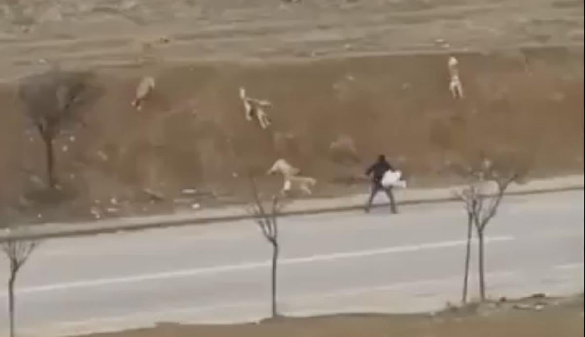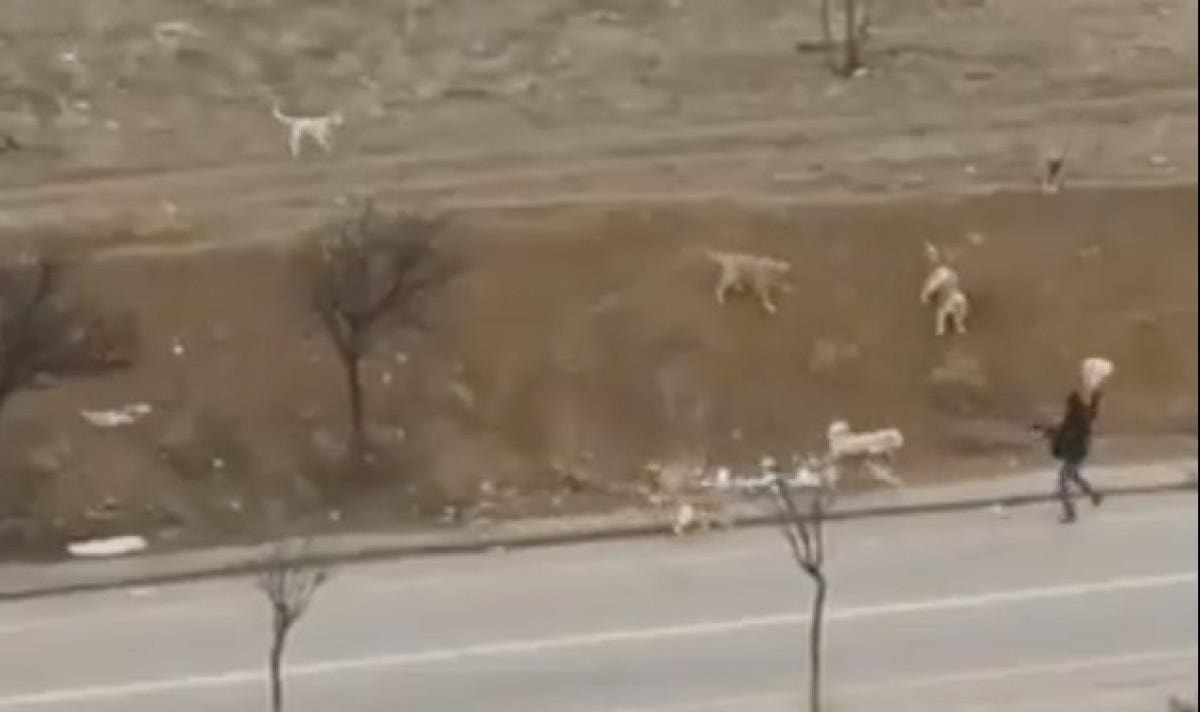 Yenimahalle'de Şehit Süleyman Şahin Caddesi'nde kaldırımda yürüyen bir vatandaşın etrafını 9 tane başıboş köpek sürüsü sardı.