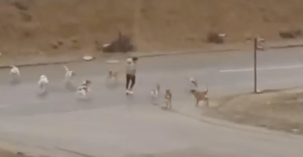 Koşmaya devam eden vatandaş, o sırada caddede ilerleyen bir arabanın kendisine yaklaşmasıyla köpeklerden kurtulmayı başardı.