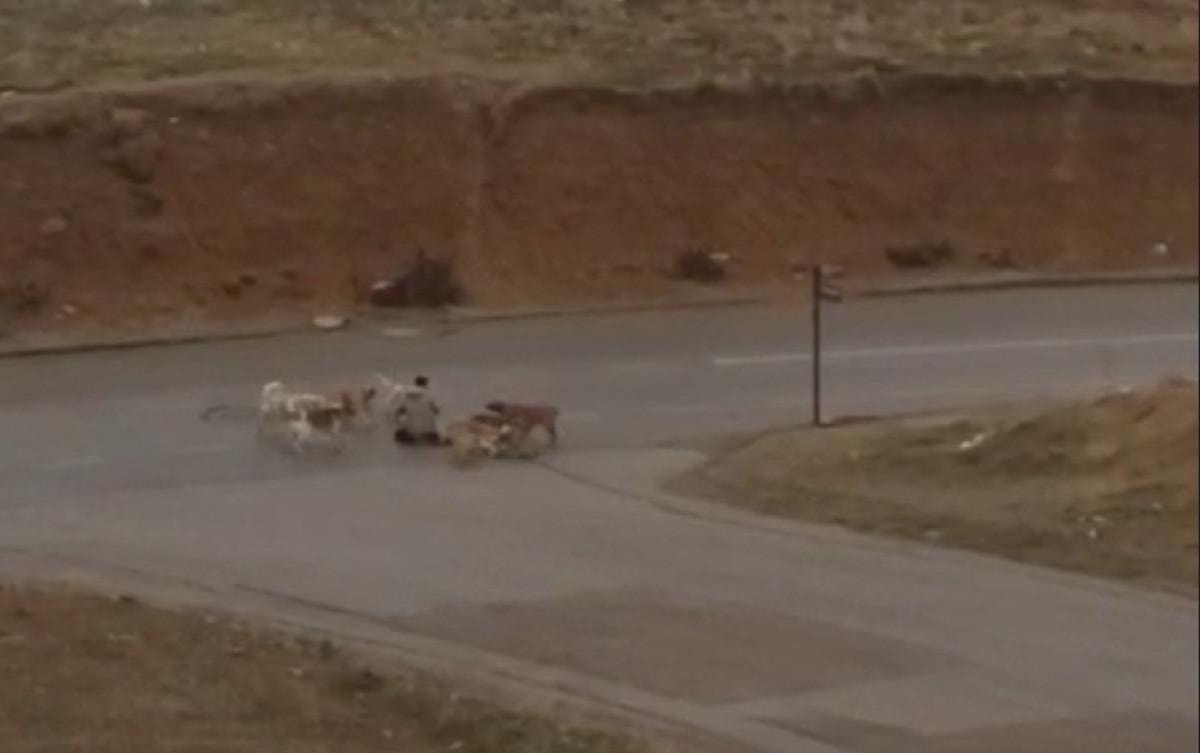 Köpeklerin bacağını ısırması sonucu yere yığılan vatandaş, elleriyle kendini savunmaya çalıştı.