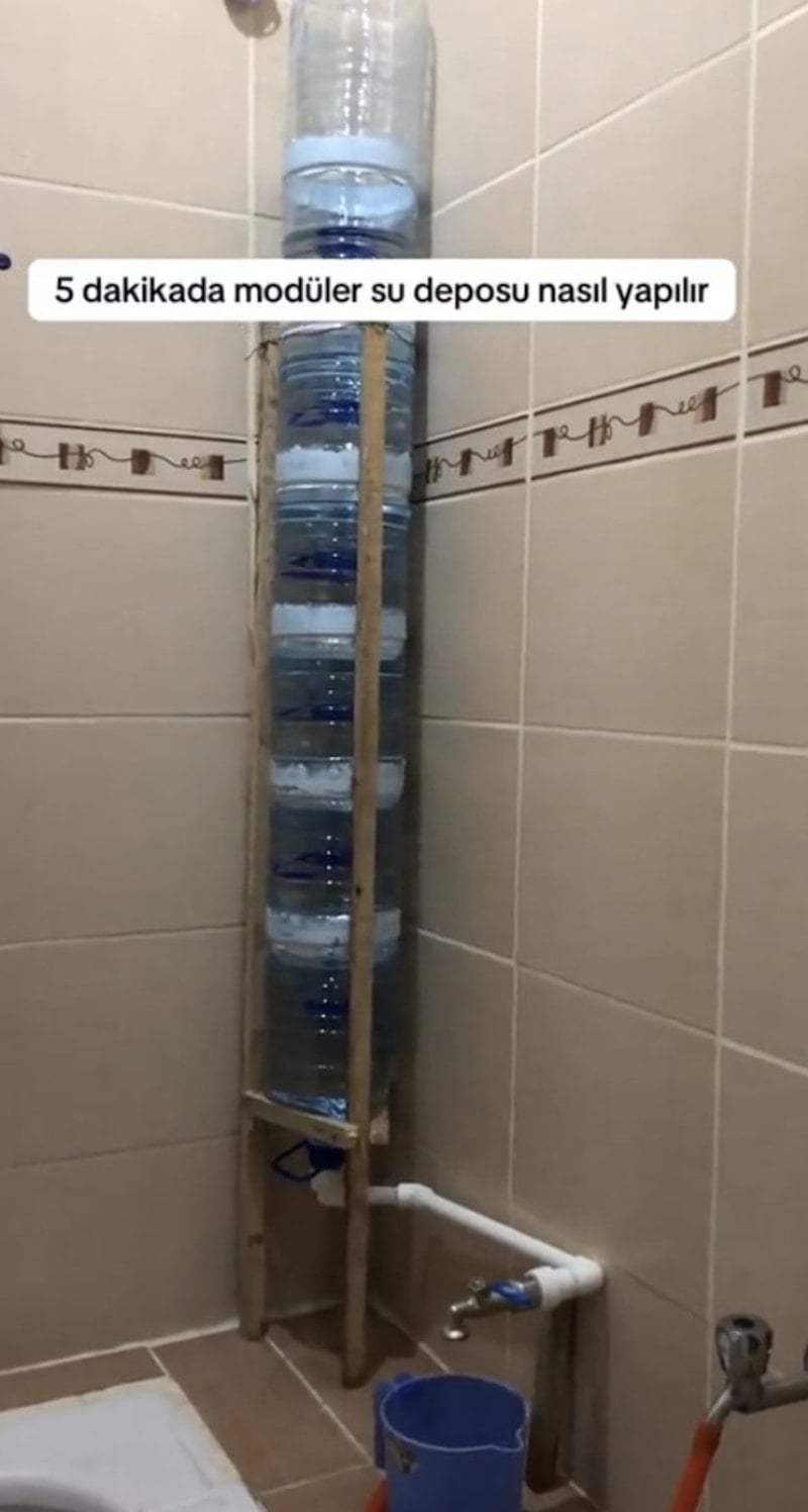 Ankara'da bitmek bilmeyen su kesintileri sonrası bir vatandaş, evinde kendisi önlem aldı. Su bidonlarını tek tek dizen vatandaş, "5 dakikada modüler su deposu nasıl yapılır?" dedi.