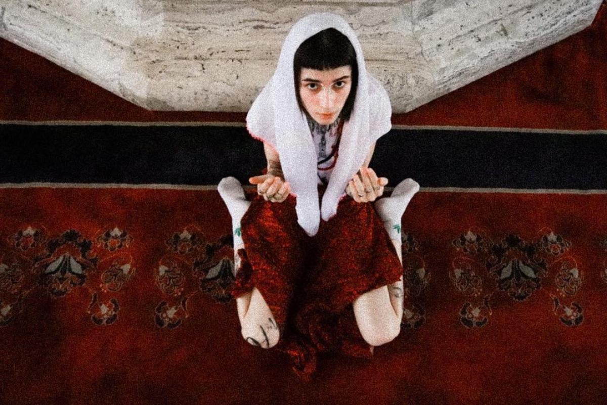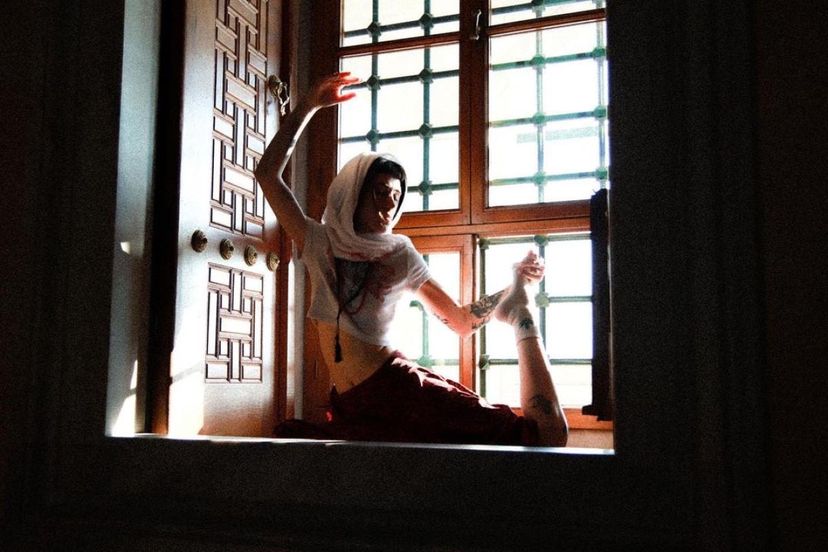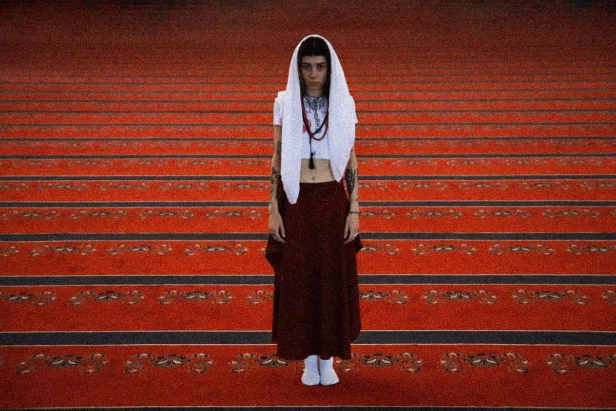 Beyaz kırpılmış tişörtün modern asi aurası, işlemeli kırmızı zemin, eteğin ortaya çıkardığı geleneksel zarafetle çarpıcı bir şekilde uyum sağlıyor. Kafasını süsleyen beyaz takke ve boynunu örten 99 boncuklu tespih, maneviyatın ve iç huzurun vücut bulmuş halini simgeliyor.