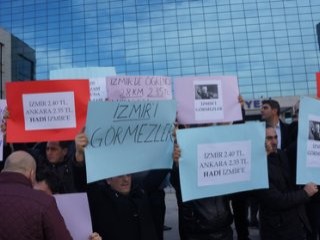 Düzenlenen karşı protestoda ‘İzmir’i görmezler’, ‘İzmir 2.40, Ankara 2.35, hadi İzmir’e’, ‘İzmir’de teleferik 6 TL, Ankara’da bedava’ dövizleri taşındı.