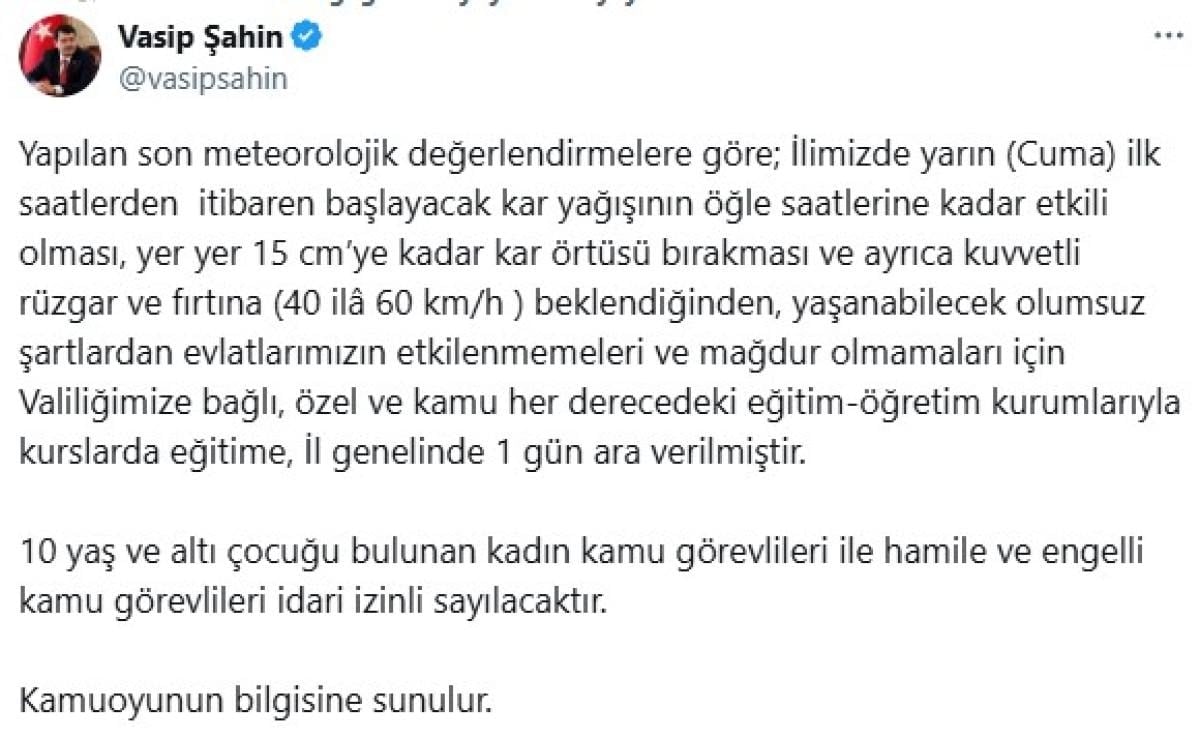 Yapılan son meteorolojik değerlendirmelere göre; İlimizde yarın (Cuma) ilk saatlerden itibaren başlayacak kar yağışının öğle saatlerine kadar etkili olması, yer yer 15 cm’ye kadar kar örtüsü bırakması ve ayrıca kuvvetli rüzgar ve fırtına (40 ilâ 60 km/h ) beklendiğinden, yaşanabilecek olumsuz şartlardan evlatlarımızın etkilenmemeleri ve mağdur olmamaları için Valiliğimize bağlı, özel ve kamu her derecedeki eğitim-öğretim kurumlarıyla kurslarda eğitime, İl genelinde 1 gün ara verilmiştir.