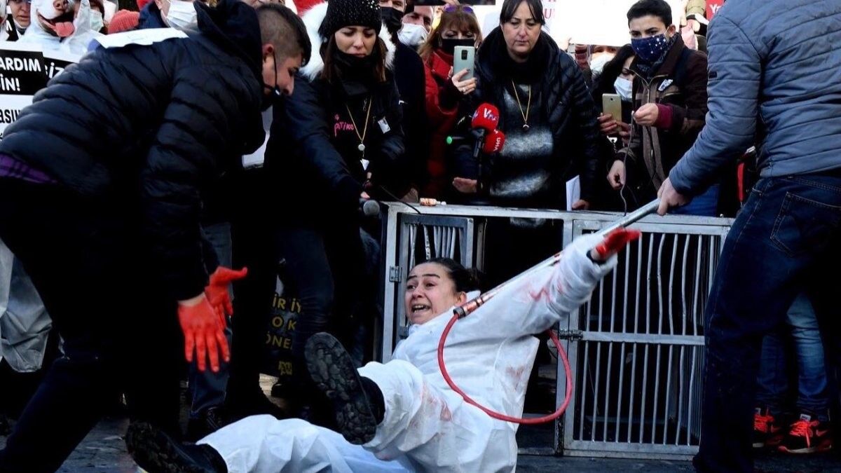 Eyleme katılanlardan bir kadın köpek kılığına girerken 2 kişi de onu yakalayıp kafese koymaya çalıştı. Bu gösteri de diğer hayvanseverlerden alkış aldı.