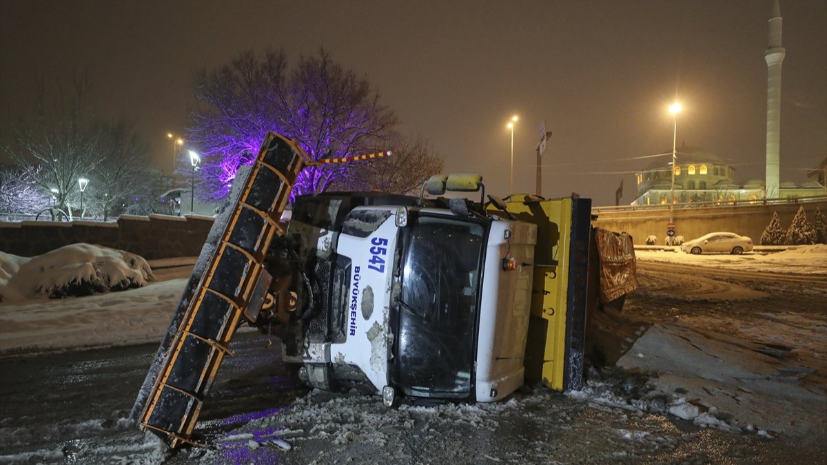 Ankara'da kar küreme ve tuzlama aracı devrildi VİDEO