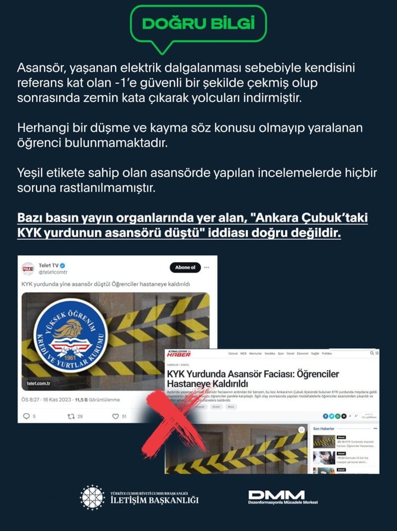 Bazı mecralarda haber olan, "Ankara'da KYK yurdunun asansörü düştü" iddiasına ilişkin Cumhurbaşkanlığı İletişim Başkanlığı Dezenformasyonla Mücadele Merkezi'nden yalanlama geldi.