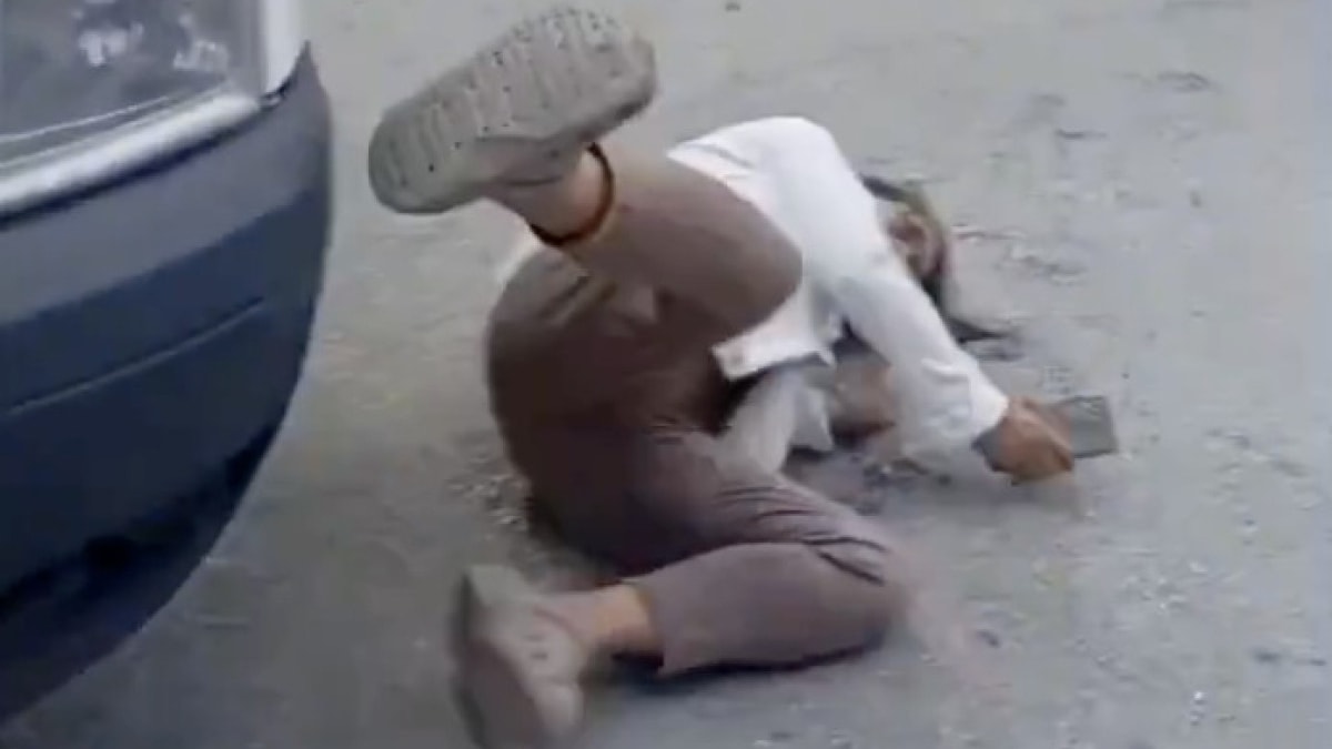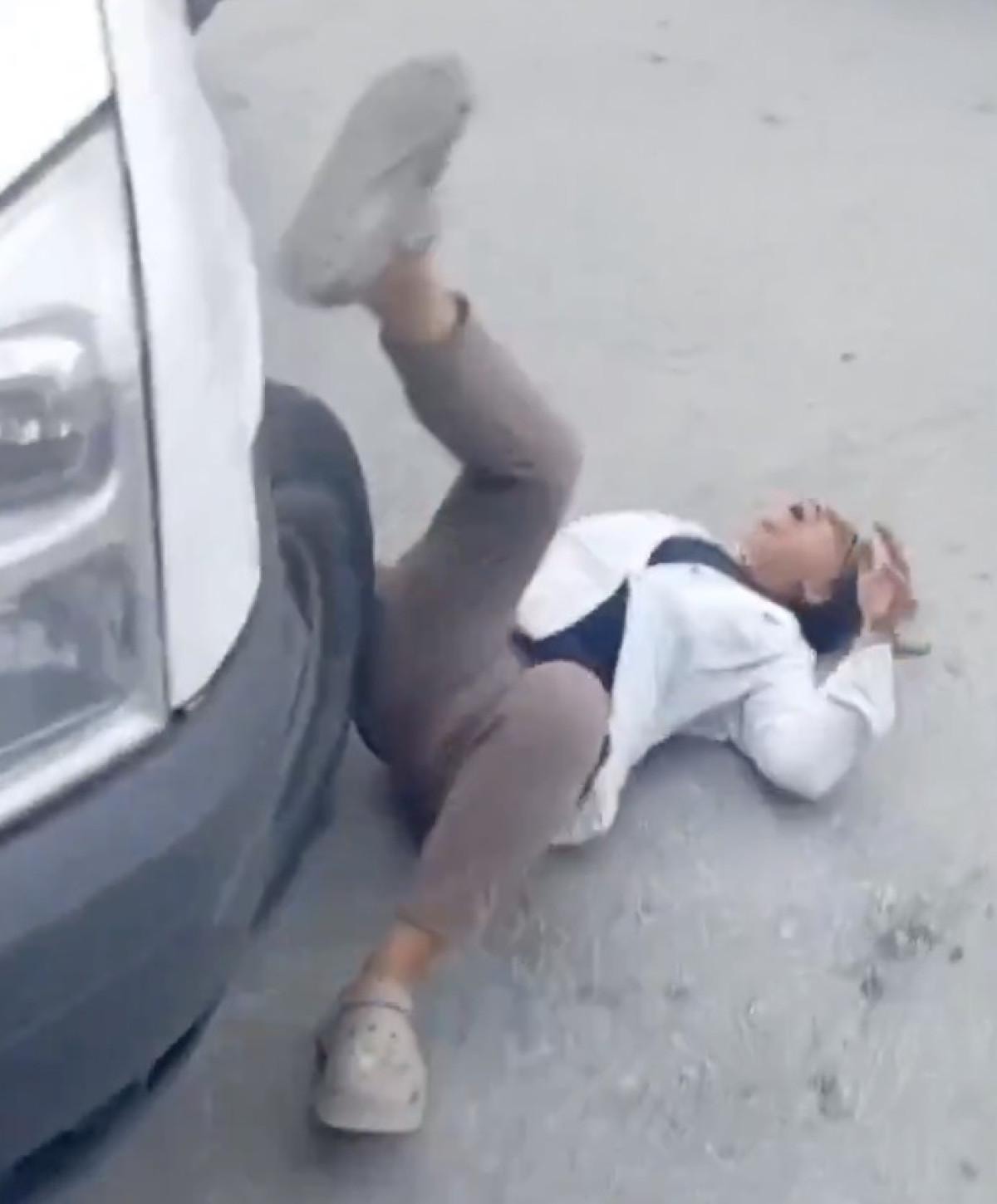 Görevlilerin işini engellemeye çalışan kadın, kendisini aracın önüne atarak bayılma numarası yapmaya çalıştı.