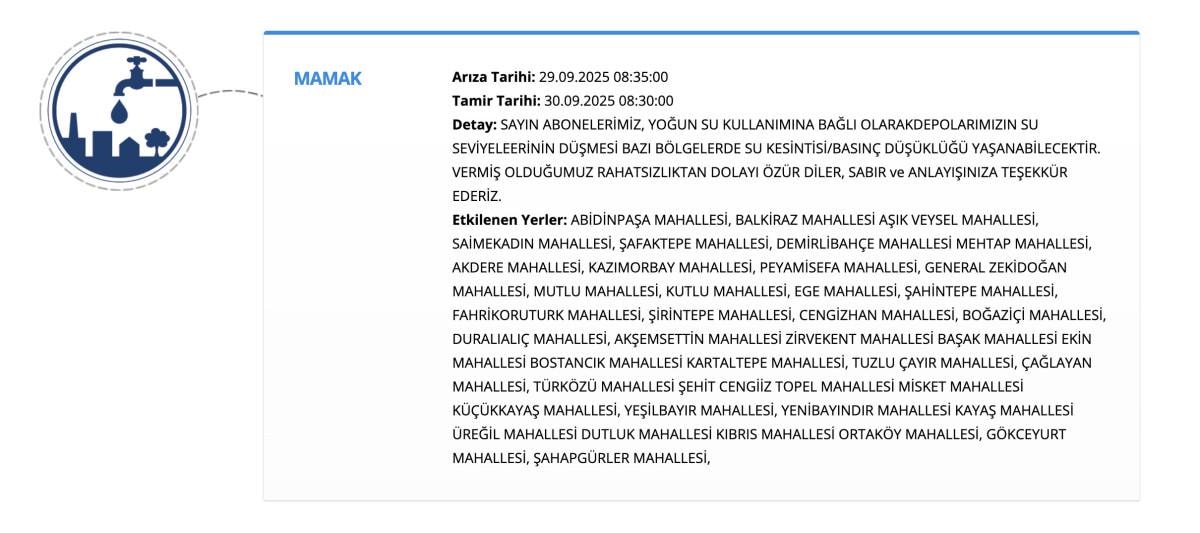- ASKİ, kesintinin 30.09.2025 Salı günü saat 08:30'a kadar süreceğini duyurdu.