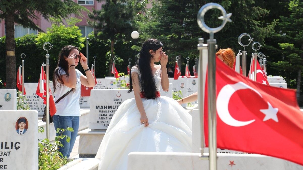 Gelinliği ile şehitliğe gelen bir şehit kızı, babasının mezarı başında gözyaşlarını tutamadı. Duygusal anların da yaşandığı şehitlik, gün boyu ziyaretçiler ile doldu taştı.