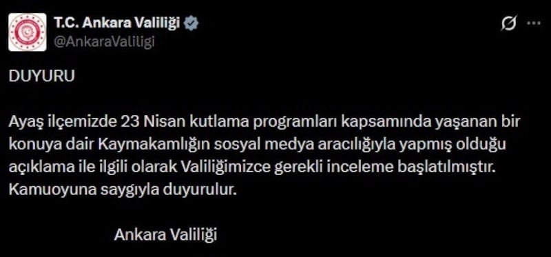 Tartışmaların büyümesi üzerine Ankara Valiliği devreye girdi. Valilikten yapılan açıklamada, Ayaş Kaymakamlığı’nın sosyal medya üzerinden yaptığı paylaşım hakkında inceleme başlatıldığı bildirildi.