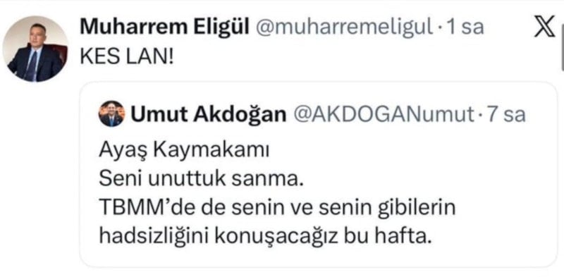 Paylaşımı nedeniyle inceleme başlatılan Ayaş Kaymakamı Muharrem Eligül'e yönelik bir paylaşım yapan CHP milletvekili Umut Akdoğan'a Kaymakam Eligül'den "Kes lan" yanıtı geldi. Kaymakam Eligül'ün bu paylaşımdan sonra hesabı kilitlediği görüldü.