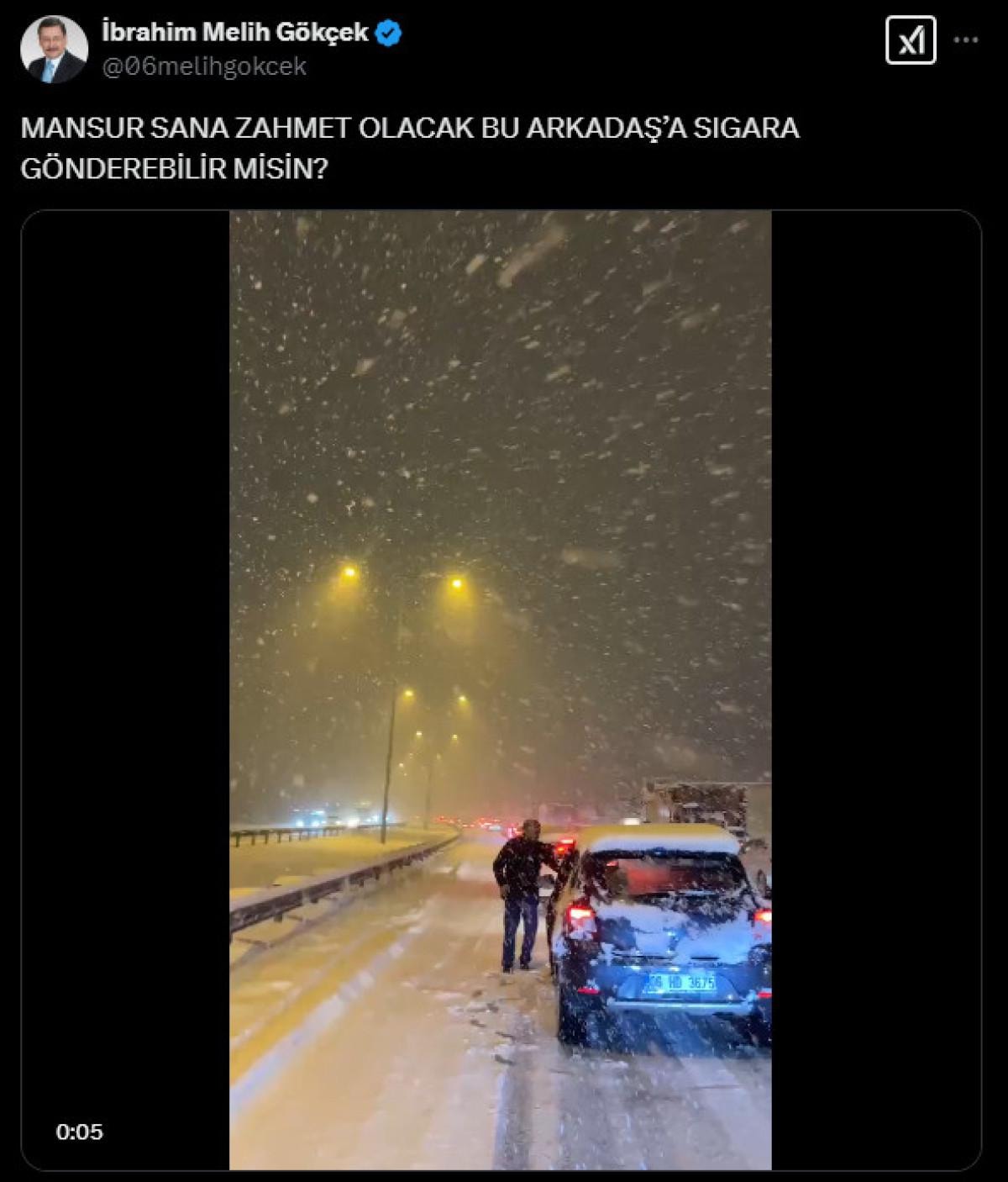 Kentte yaşanılanlara tepki gösteren eski Ankara Büyükşehir Belediye Başkanı Melih Gökçek de sosyal medya hesabından, "Mansur itenler yetersiz kaldı... Lütfen yetiş... Lütfen Mozambik'ten atla uçağa hemen gel... Sensiz olmuyor... Hoş sen olsan da olmuyor..." gibi paylaşımlarda bulundu.