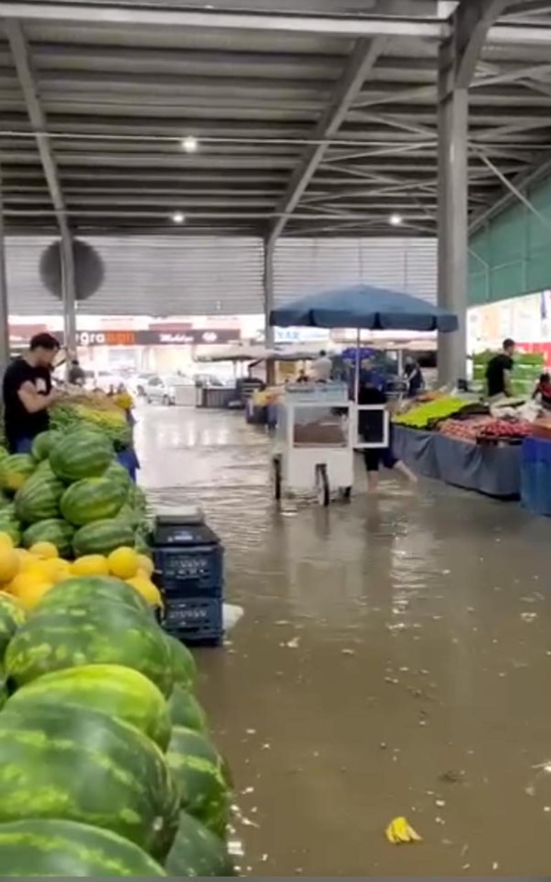 Sincan'daki Yenikent pazar yerini de su bastı. Su içinde kalan pazar yerinde esnaf ürünlerinin zarar görmemesi için önlem almaya çalıştı.